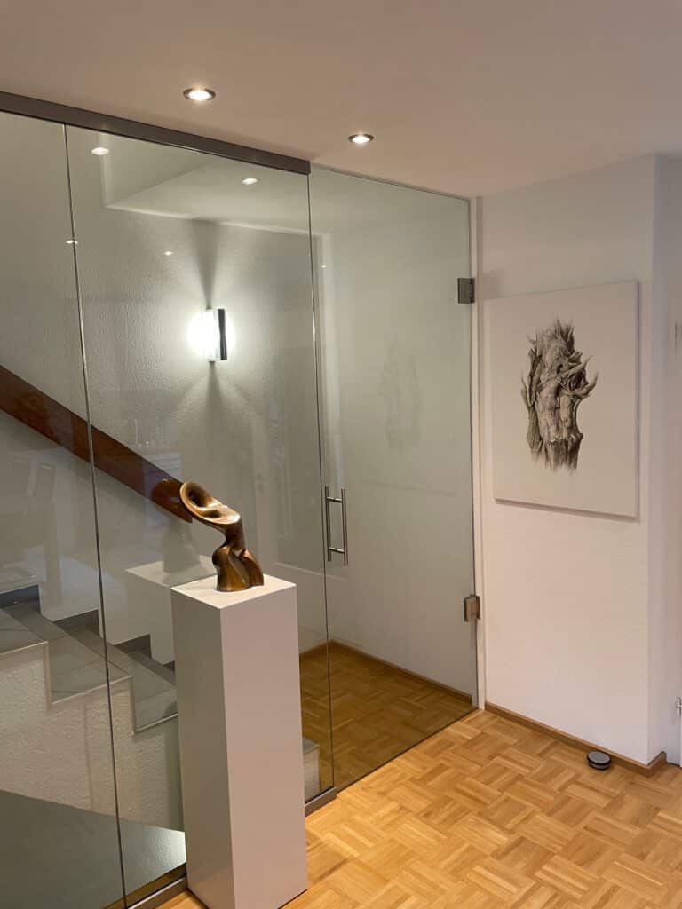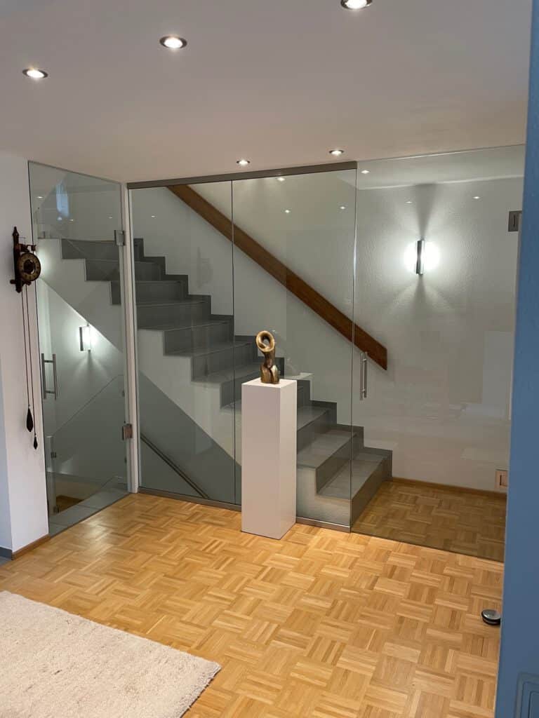 In diesem Treppenhaus haben wir ein vorhandenes Metallgeländer durch eine Glastrennwand mit 2 raumhohen Türen ersetzt. Das Treppenhaus, welches vom Keller bis ins Obergeschoss durch geht, ist nun vom Wohnraum abgetrennt. Die Kälte bleibt im Keller und zieht nicht mehr in den Wohnbereich hinein. Die Gläser am Treppenlauf haben zusätzlich eine absturzsichernde Funktion und sind deshalb aus Verbundsicherheitsglas ausgeführt. Die beiden raumhohen Türen sind über hydraulische Pendelbänder rechts direkt an der Wand und links an einer neu eingebauten Stütze befestigt. Eine echte Aufwertung für das Treppenhaus und den gesamten Wohnraum!!!